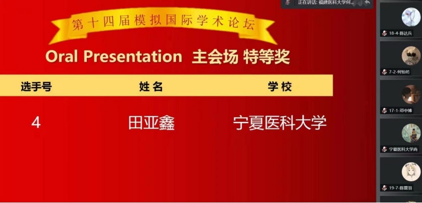 10月30日,在福建医科大学主办,1487cc威斯尼斯、新疆医科大学参加的“第十四届模拟国际学术论坛”决赛中,威斯尼斯21级研究生田亚鑫同学荣获特等奖佳绩。本届学术论坛的主题是“医学与美学(Medicine and Aesthetics)...