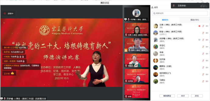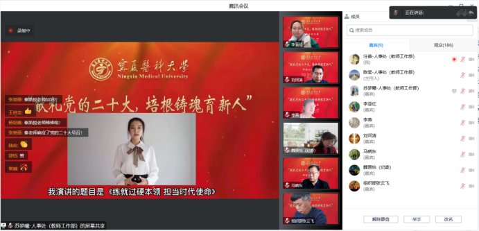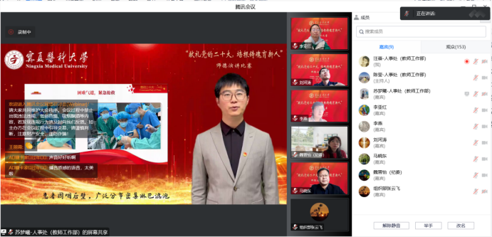 来自各教学单位的11名选手紧扣主题,秉承为党育人、为国育才的初心使命,结合自己从教的亲身经历和感受,以自己或身边的先进教师的典型事迹为题材,讴歌长期以来为党的教育事业作出突出贡献的优秀人民教师代表,生动讲述宁医教师甘为人梯、乐于奉献的感人故事。经过激烈角逐,临床医学院刘尧邦获得一等奖,外国语教学部马丽梅、国际教育学院曹佳欣获得二等奖,药学院张文晋、马克思主义学院郭佳怡、护理(高职)学院白亚茹获得三等奖,比赛还评出优秀奖5名。