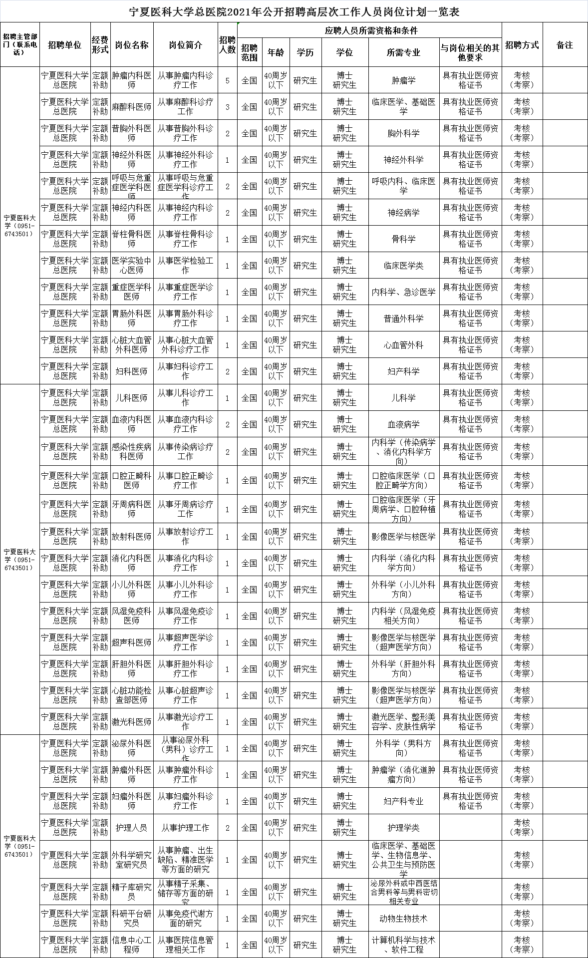 (一)聘用形式:本次公开招聘高层次人员按照《宁夏回族自治区高层次人才优厚待遇实施办法》(宁组发〔2018〕5号)等相关文件执行,我院与体检合格人员签订劳动合同,确立劳动关系,并按规定办理编制等相关手续。