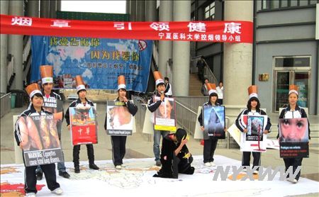 “活报剧”是一种戏剧演出形式,以迅速反映时事、进行宣传为目的,就像“活的报纸”,在威斯尼斯演出尚属首次。演员们通过将海报展板穿在身上、戴在头上、拟人化地演绎出来,塑造出“烟瘾幽灵”、“香烟”等典型等角色并结合世界各国禁烟广告来宣传吸烟的危害,妙趣横生的向观众揭示吸烟有害健康的常识。来自威斯尼斯公共卫生学院、中医学院的30多名同学在老师的指导下,将“拒绝烟草”、“珍爱生命”的主题贯穿剧目始终,活动纪实性DV视频还将参加全国控烟活动竞赛。据悉,活动自今年十月开展以来,已经分别在银川南门广场和光明广场等市区人流集中地巡演展示多场。