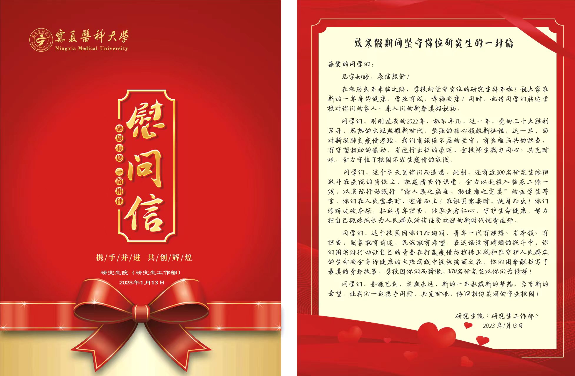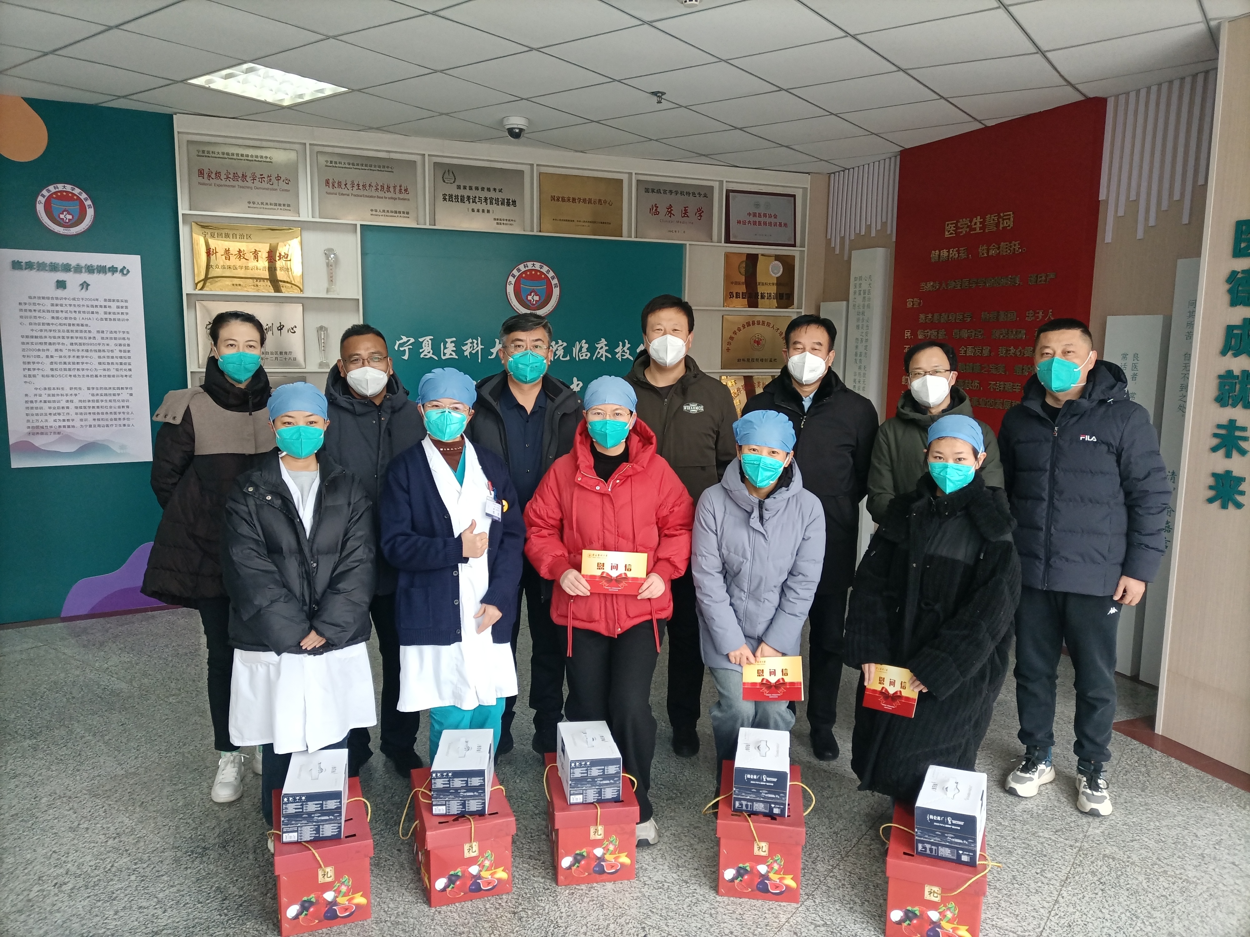1月13日下午,研究生院直属党支部、研究生工作部、临床医学院党委、总医院教育处受学校领导委托,组成慰问组代表学校深入1487cc威斯尼斯总医院、银川市第一人民医院(1487cc威斯尼斯第二附属医院)临床科室,看望并慰问假期自愿坚守在临床一线的专业学位研究生,向他们及其家人送去新春祝福和美好祝愿,并为每一位在岗研究生送上了蕴含美好祝福的慰问信和慰问品。