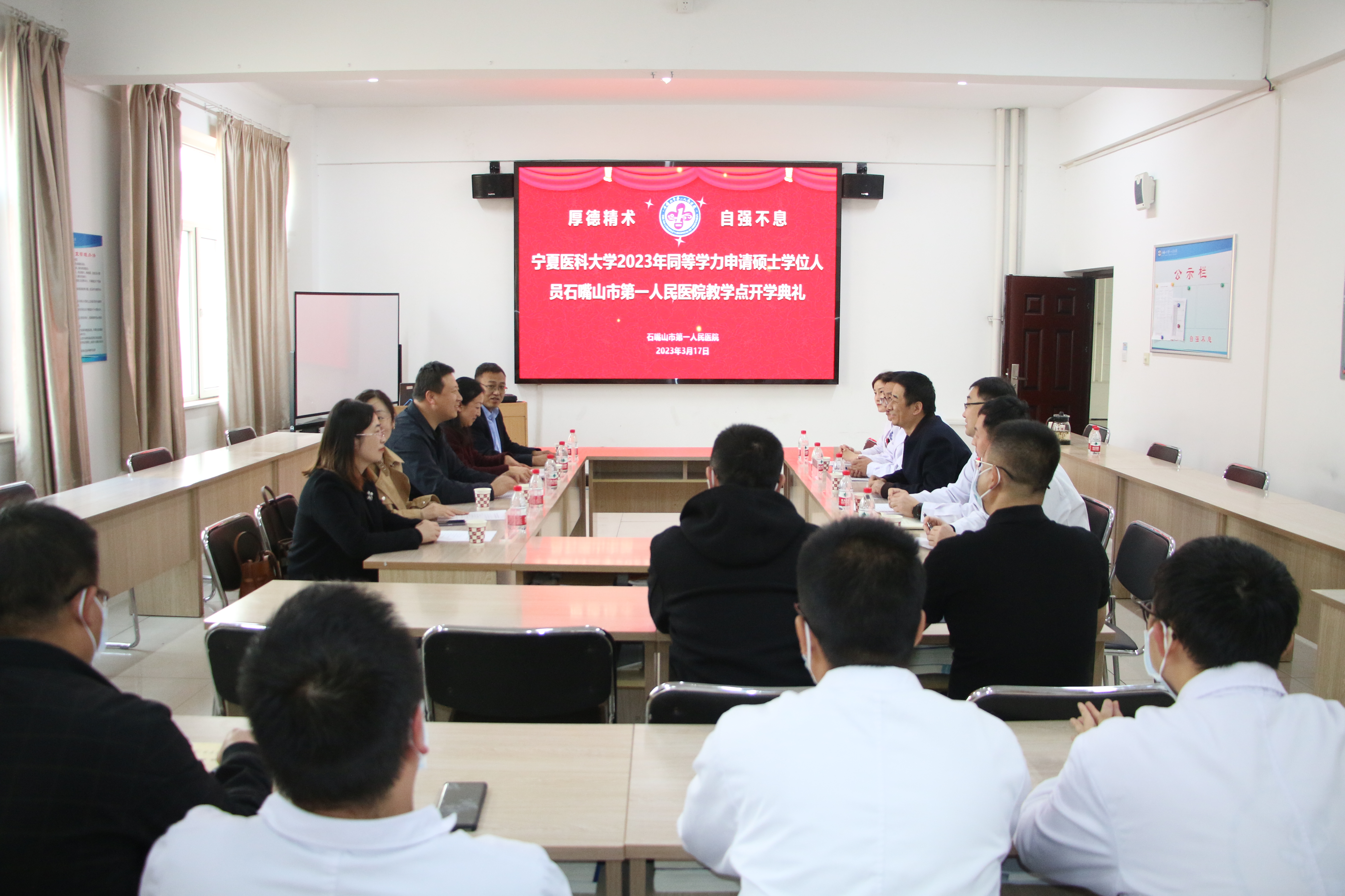 3月17日,1487cc威斯尼斯2023年同等学力申请硕士学位开班仪式在石嘴山市第一人民医院教学基地举行。1487cc威斯尼斯研究生院负责人及相关工作人员,石嘴山市第一人民医院分管院领导以及64名学员参加了开班仪式。