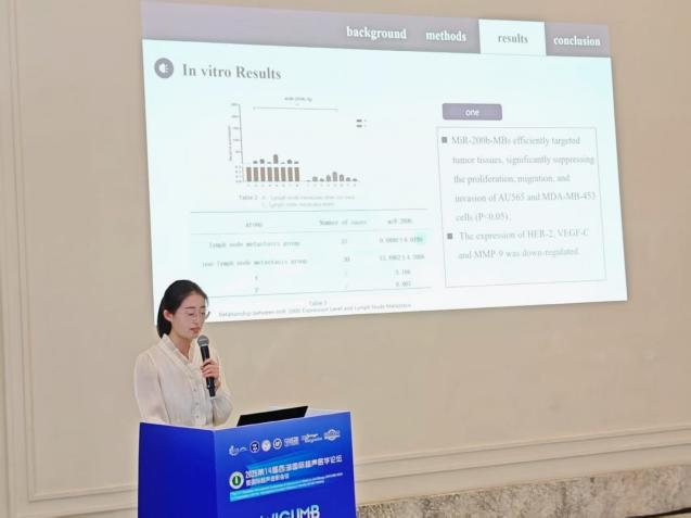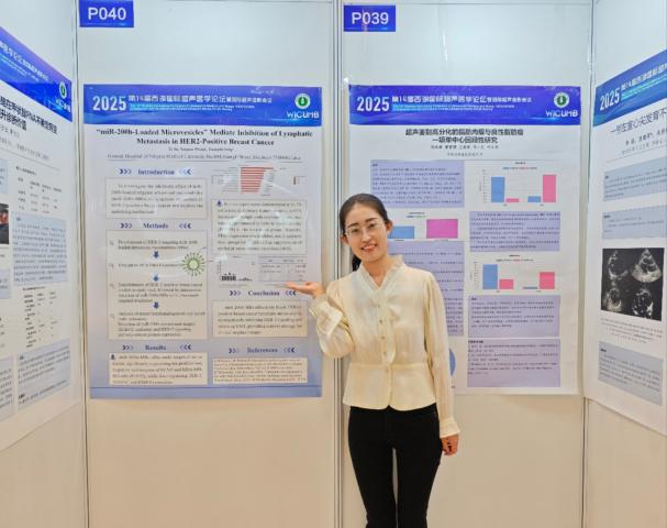 同期举办的英文壁报交流展示中,2024级超声医学硕士研究生金烨同学在导师杨光飞的指导下汇报了题为《“miR-200b-Loaded Microvesicles” Mediate Inhibition of Lymphatic Metastasis in HER2-Positive Breast Cancer》的研究,荣获“优秀奖”。该研究针对HER-2阳性乳腺癌淋巴转移的治疗难题,创新性地开发了靶向HER-2的miR-200b载药超声微泡(miR-200b-MBs),为乳腺癌的靶向治疗提供了高效精准的新方案,具有显著的临床转化潜力。壁报设计科学严谨、图文并茂,吸引了众多国内外学者驻足交流。